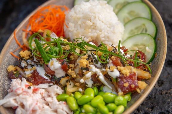 Ahi | edamame | house poke sauce | sweet local onions | scallions | limu | imitation crab salad | garlic crunch aioli | white rice